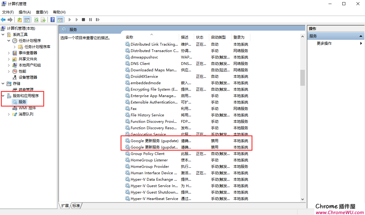 然后在下方的【服务和应用程序->服务】中,找到两个和Google更新相关的服务【Google更新服务(gupdate)】、【Google更新服务(gupdatem)】,并右键,选择属性,把启动类型改为禁用。