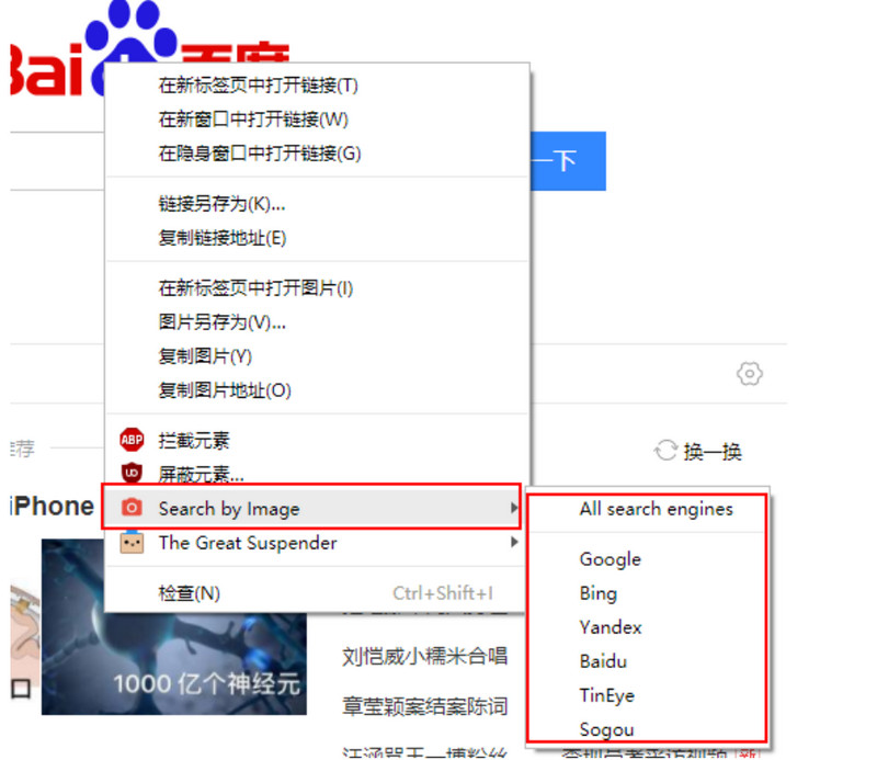 - 搜索图片:按住快捷键(默认设置为 Ctrl 键),同时在图片上点击鼠标右键,在菜单中选择欲使用的搜索引擎。