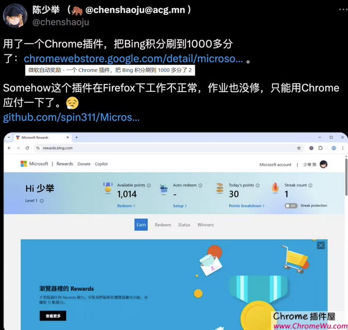 微软自动奖励(Microsoft Automatic Rewards)是一个 Chrome 插件,通过自动完成每日任务获取 Bing 积分。安装插件之后,只需要登录 Microsoft Rewards 和 Bing 即可